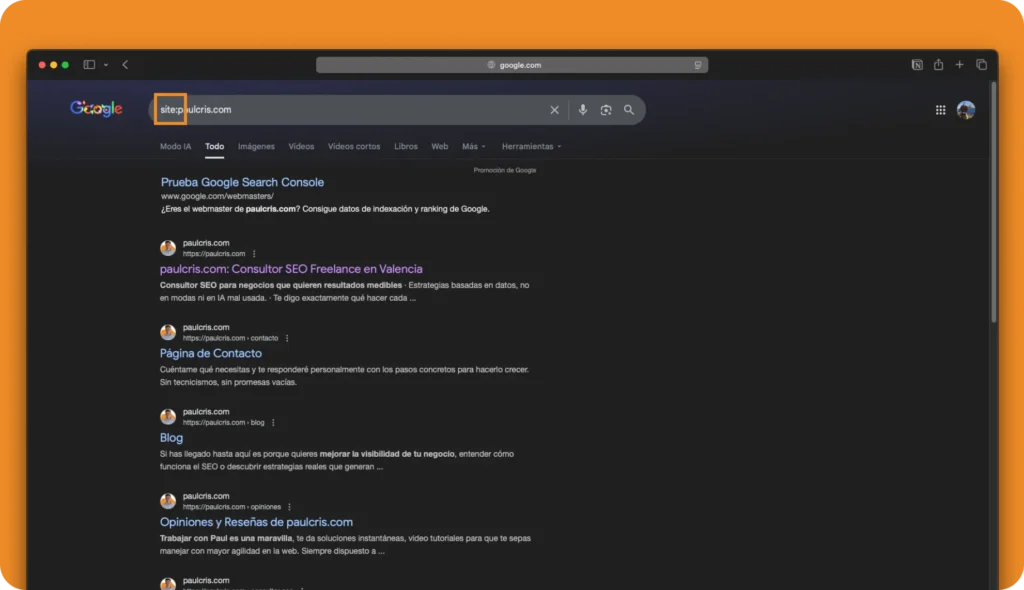 Antes de meternos en diagnósticos, usa esta comprobación rápida para ver qué tiene Google de tu dominio.